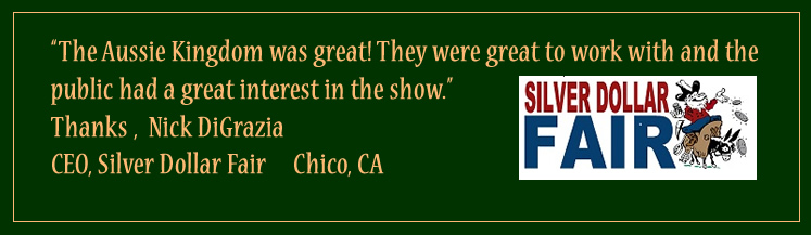 "I appreciate all that you did to bring Aussie Kingdom to the Montgomery County Agricultural Fair in 2012. The show was well received by all and we leave the door open for a return in the future.