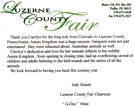 First I would like to say, what a pleasure it was to have the Aussie Kingdom Show at the 2009 South Florida Fair in January. What a great, educational show. The people watching the show each day learned about Kangaroos, Wallabies, Lizards and Kookaburra’s from Australia. The exhibit was clean and setup in a way that the Fair customer could see the animals in a natural looking setting.