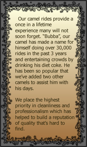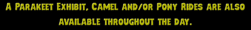 Experience our interactive, hands on exotic animal petting zoo; it has been a popular attraction at many fairs and festivals throughout the southeast. They have 40-50 animals which include 15-20 rare and exotic species from around the world! The exhibit places the highest priority in cleanliness and professionalism which has helped to build a reputation of quality that's hard to find. Camel and/or Pony rides are also available throughout the day. |