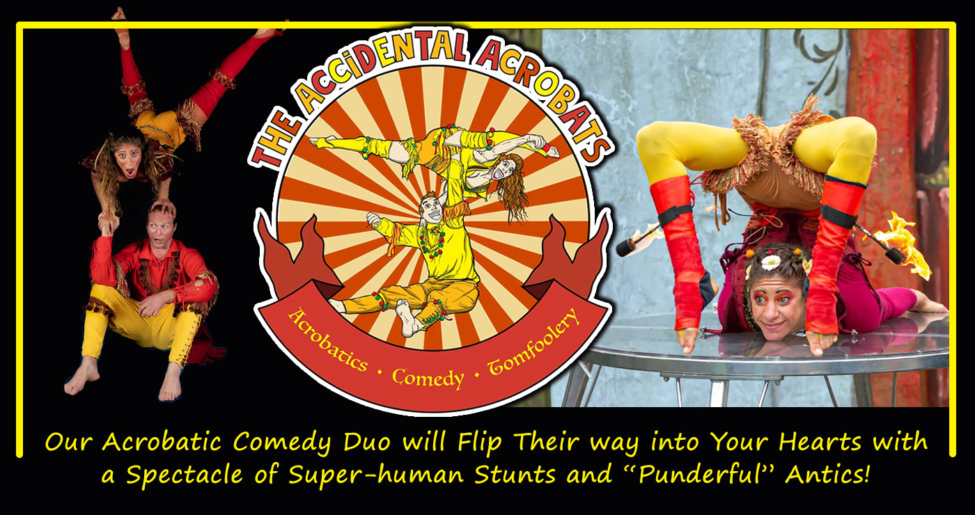 SHOW DESCRIPTION: Leila & Thomas, The Accidental Acrobats will captivate you with their high-energy, acrobatic, and aerial stunt performance. This exhilarating show, filled with breathtaking flips, tumbles, and daring feats, promises to leave a lasting impression on all who attend. Audiences will be amazed by a dynamic blend of aerial and acrobatic comedy stunts, featuring incredible displays of skill both on the ground and in the air. Highlights include partner acrobatics, hair hanging, contortion, fire breathing, whip artistry, comedy, foot archery, and feats of extraordinary human strength. Combining strength, flexibility, and humor, these two Guinness World Record holders deliver an unforgettable experience that entertains, inspires, and engages audiences of all ages.