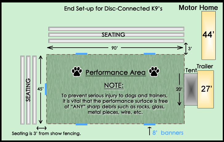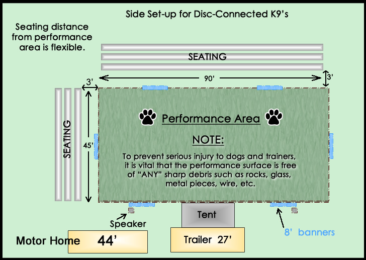NOTE: The show is capable of performing on a smaller area, but this has to be approved prior to signing a contract and it sometimes does affect certain aspects of some dog’s performances.