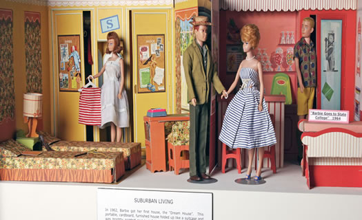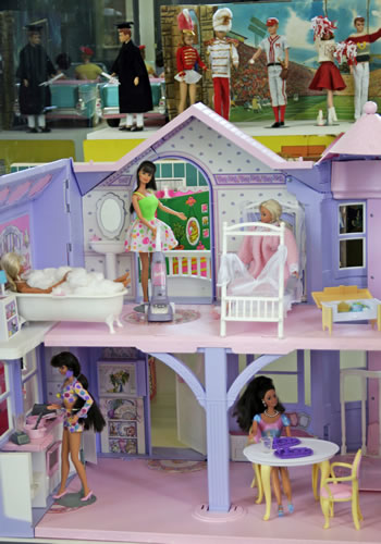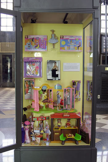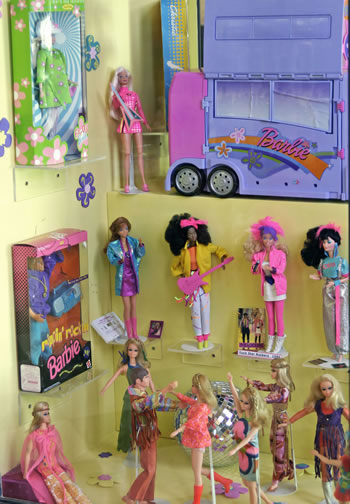 Take a history lesson with the above, one of ten, displays. Featured are the many fashion doll family members, autos, and many examples of the facial and physical changes America's favorite fashion doll has gone through. For those who are unfamiliar, all are conveniently labeled and dated.