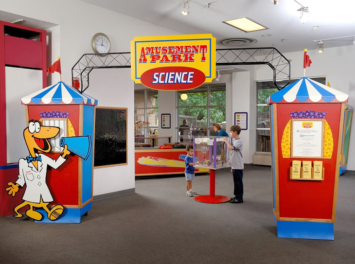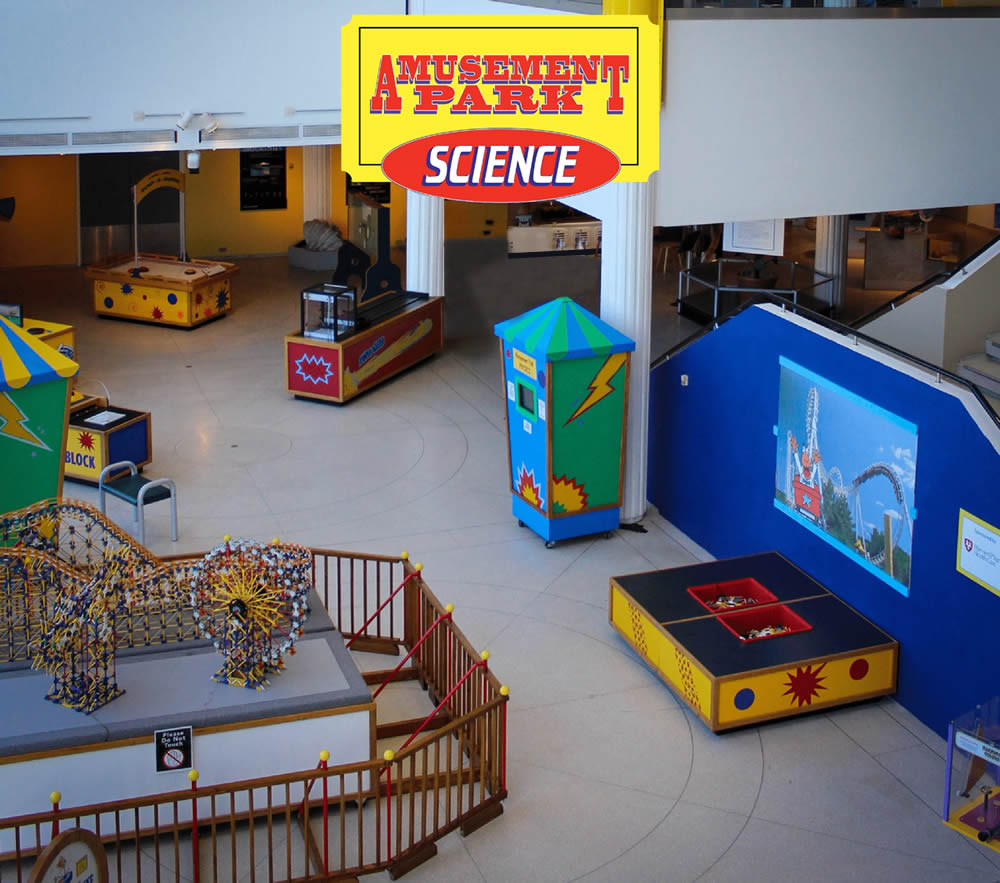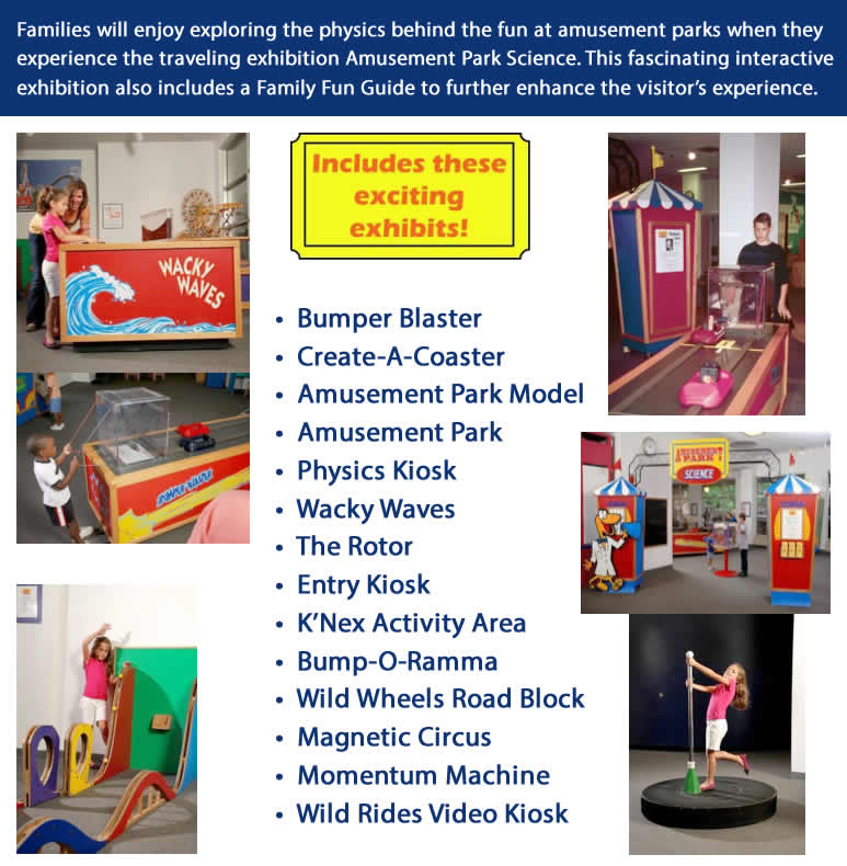 The Amusement Park Science Exhibitinvites visitors to explore a dozen different interactive features that provide a hands-on taste of how our favorite amusement park rides work. Everyone loves amusement parks but few understand the inner workings. Kids and adults will both love to explore this exhibit.