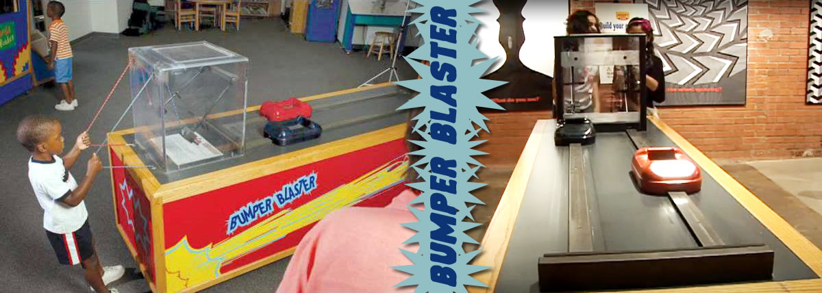 Round, molded polyurethane cars with rubber bumpers simulate the “action and reaction” of a bumper car ride.