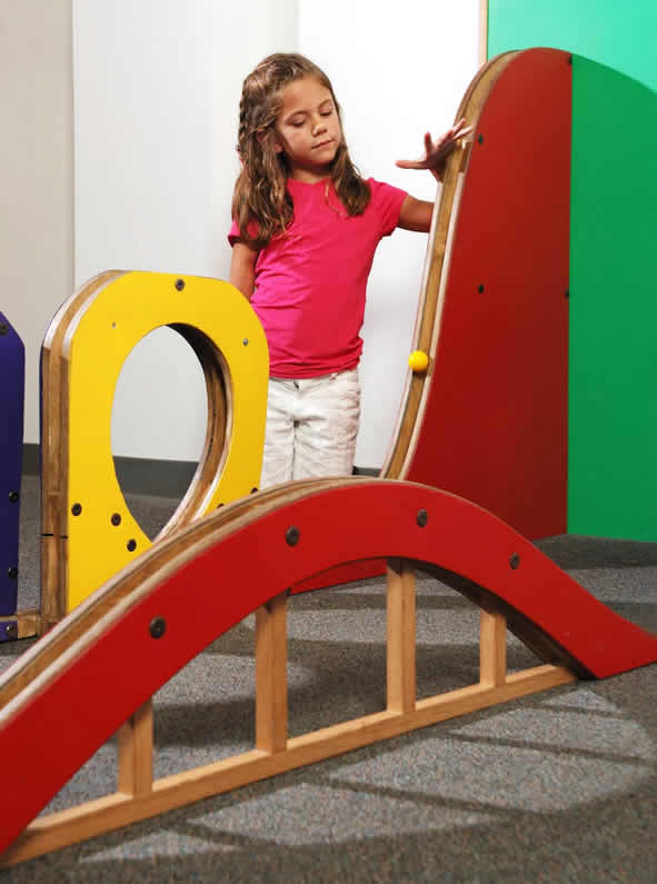 Visitors can experiment with potential and kinetic energy by setting up a roller coaster track. Hills and circular loops made from wooden tracks can be fit together in different combinations.