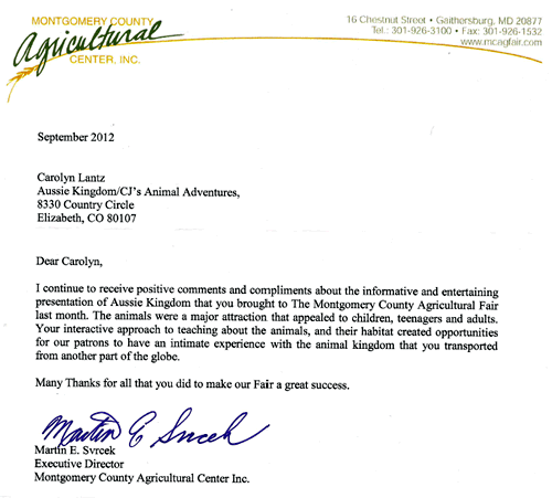 "I appreciate all that you did to bring Aussie Kingdom to the Montgomery County Agricultural Fair in 2012. The show was well received by all and we leave the door open for a return in the future.