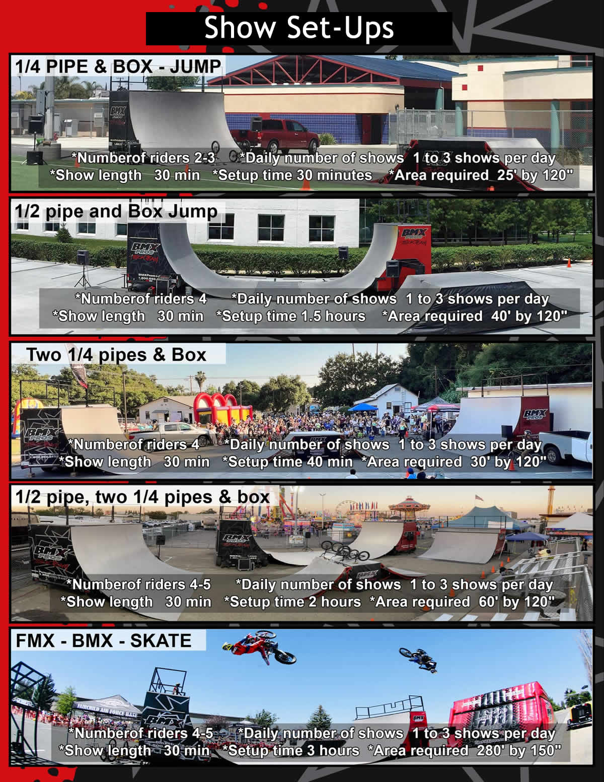 SHOW DESCRIPTION: The BMX Pros stunt show features the world’s most extreme bicycle stunt riders in a spectacular, non-stop, action-packed show that can feature our Half Pipe and/or Quarter Pipe accompanied by our box jumps. Our BMX bike show has entertained millions of people around the world. The BMX Pros Stunt Team will bring to your venue the same championship talent that competes in the X-Games. This crowd-pleasing event is definitely a must see to believe attraction that will amaze your audience.