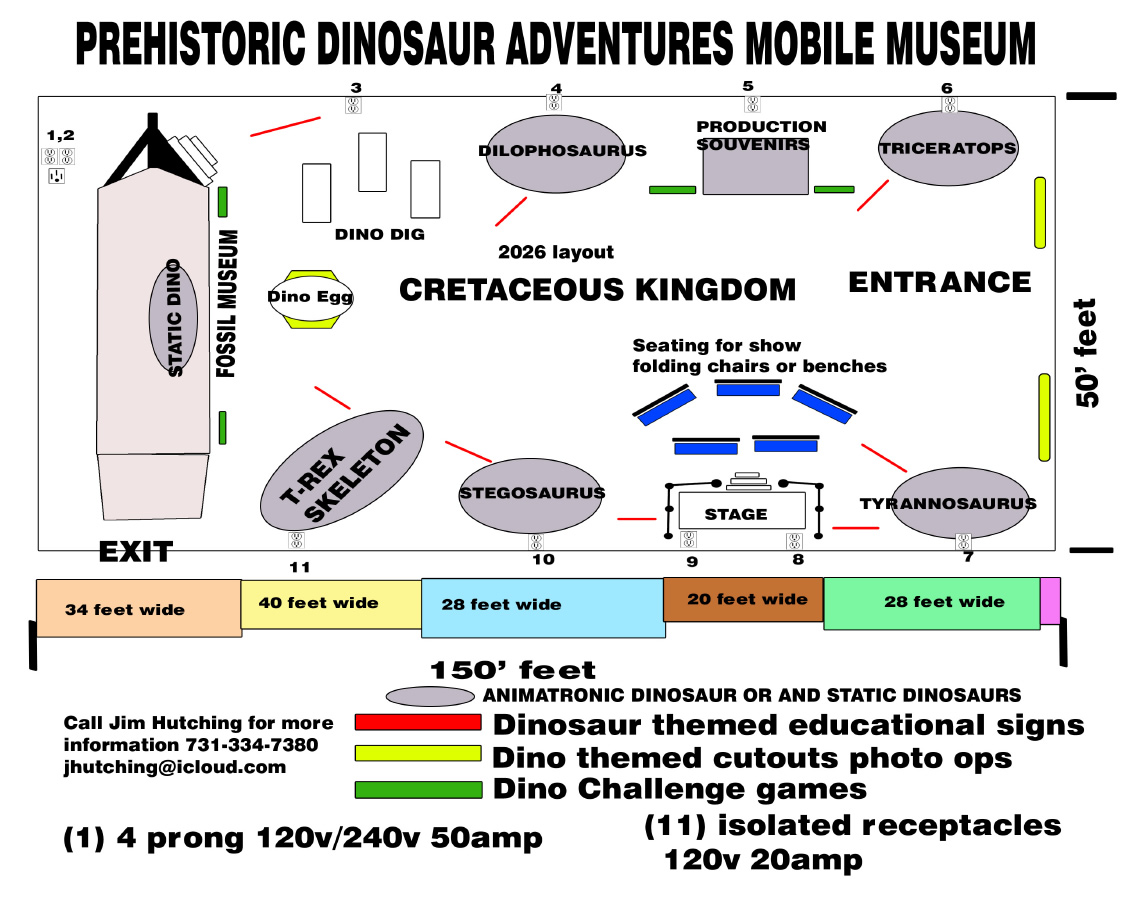 Dimensions: minimum 50' width (left to right) by 150' (deep) starting from front to back. The museum trailer will be set up with the passenger side facing the public as shown in our layout; the hitch area marks where the power hookup is. Please see our museum layout diagram for details.