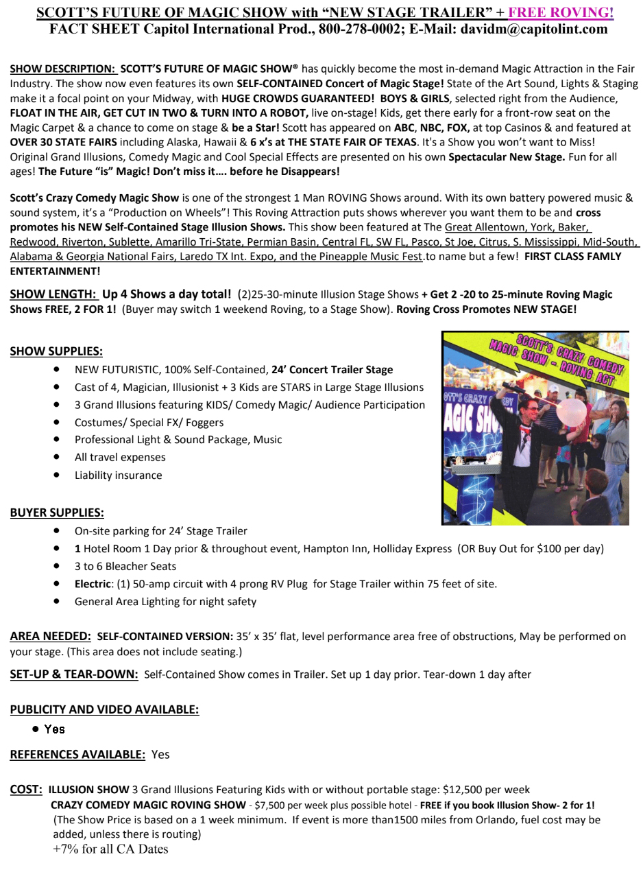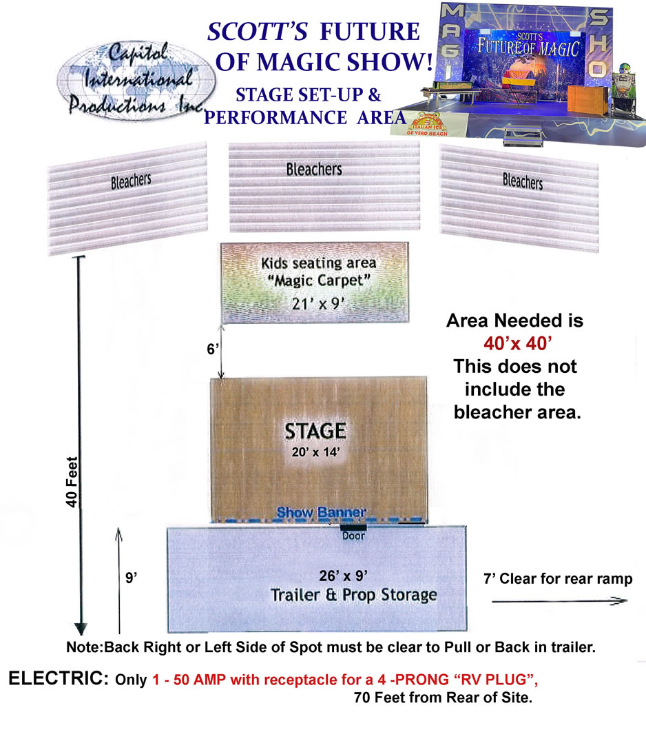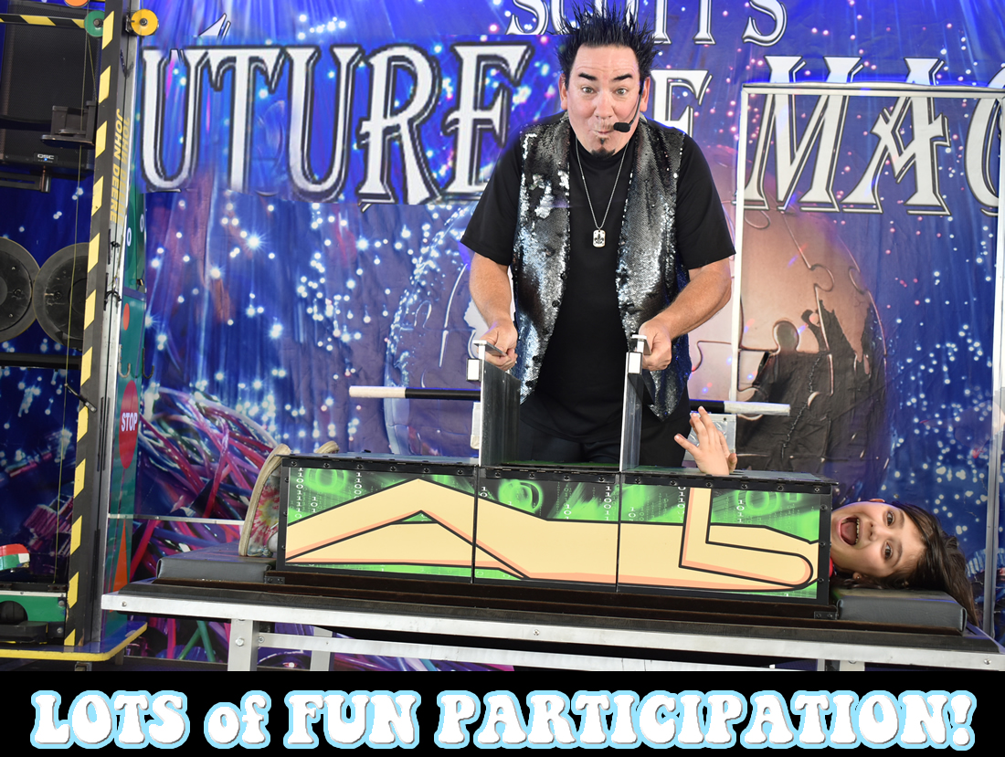 Scott presents another 1st class, turn key production on its own BRAND NEW TRAILER STAGE. This Time, it�s all about the FUTURE� Our KIDS. Boys & girls, selected right out of the Audience, get to come on Stage & Float in the Air, get Divided in Half & Turn into a Robot!