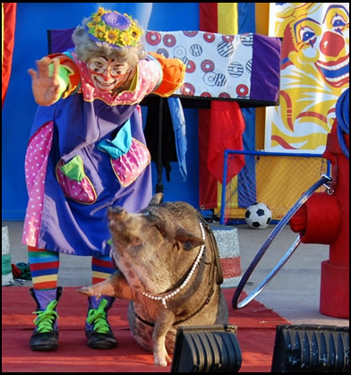 Bob received his performance training at Center College in Kentucky, and at Ringling Brothers Barnum & Bailey Clown College in Florida. Mariah trained at the Dell’Arte School of Mime and Comedy, and at the Pacific Conservatory of Performing Arts, both in California. The pups and pigs, hailing from various parts of the country, take primary credit for having trained their humans in the art of zaniness.