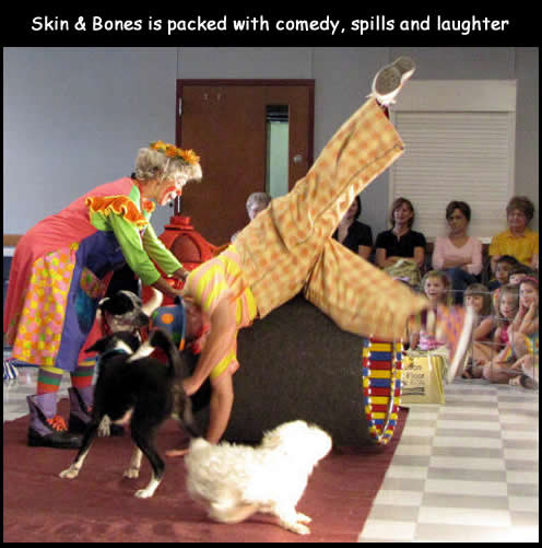 Bob and Mariah’s full-length show, Skin & Bones’ Comedy Circus, is great family entertainment, featuring trained dogs and potbellied pigs, juggling, low wire, magic, and plenty of comedy!