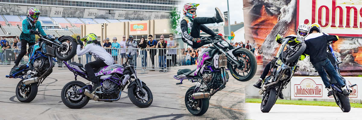 SHOW DESCRIPTION:Twinstunts bring a very unique action-packed motorcycle thrill show. The show consists of any array of stunts: wheelies, acrobatics, burnouts, tandem and many more advanced maneuvers on multiple bikes including a flip bike, all while maintaining safe control of the machines at all times. They embrace their twin features by doing tricks simultaneously, interacting with each other during tricks, and even doing tricks on one bike together. With their unique twin characteristics and energy, they are really able to interact with crowds to produce an exciting experience they will remember. In addition, they spend time with their fans signing autographs and giving out merchandise.