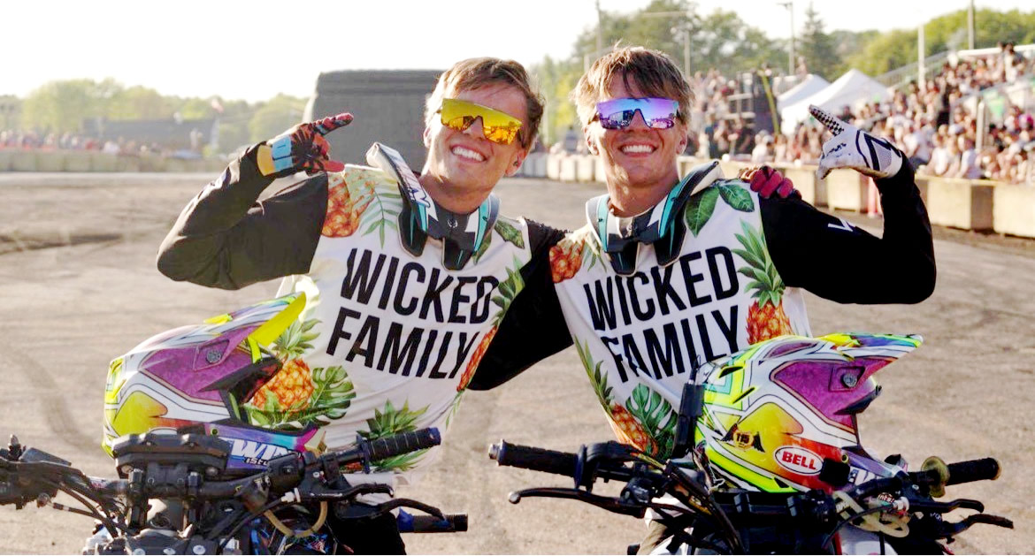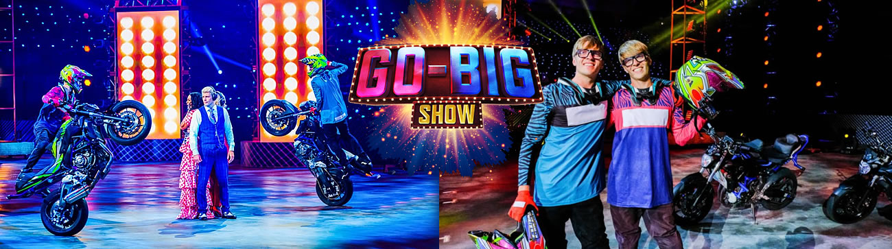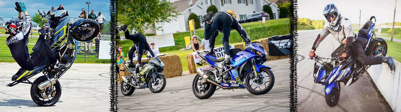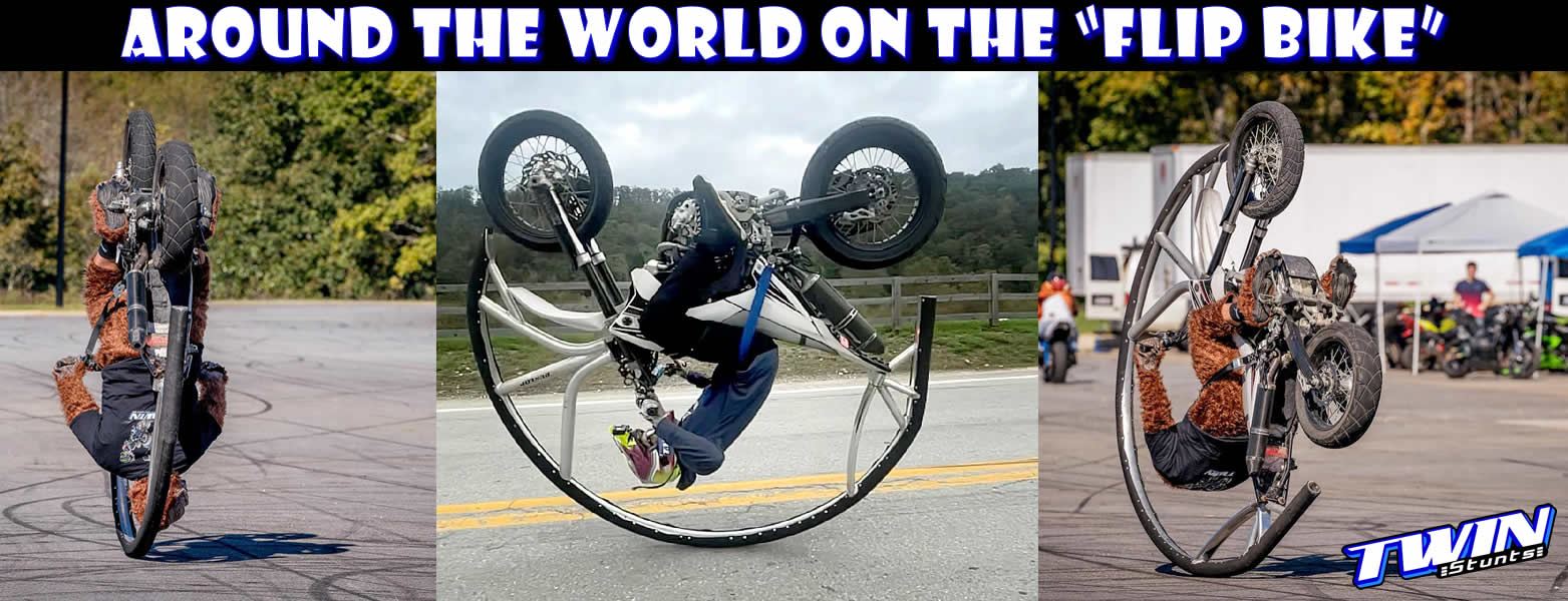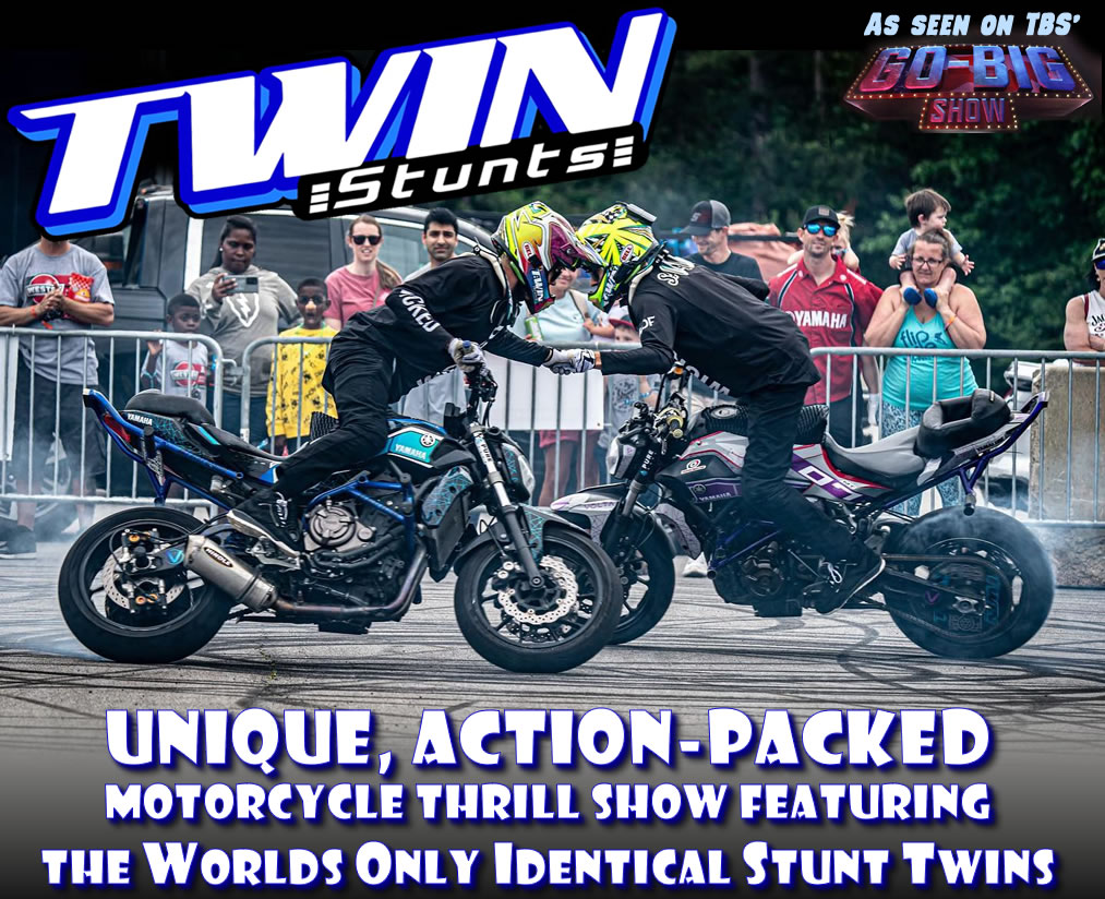 The show consists of any array of stunts: wheelies, acrobatics, burnouts, tandem and many more advanced maneuvers on multiple bikes including a flip bike, all while maintaining safe control of the machines at all times. They embrace their twin features by doing tricks simultaneously, interacting with each other during tricks, and even doing tricks on one bike together.