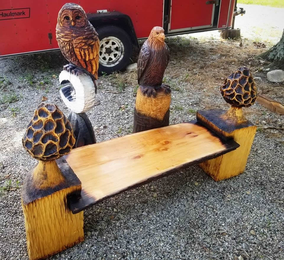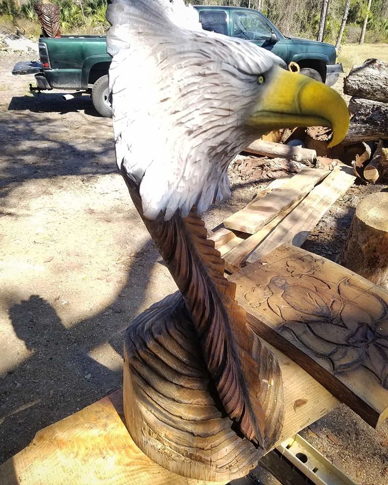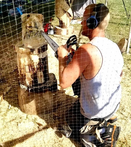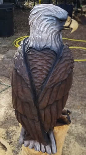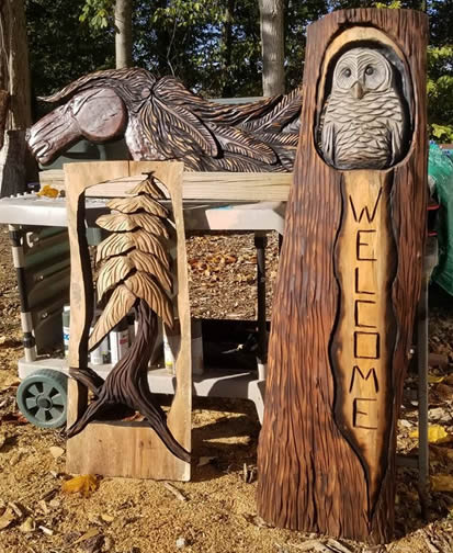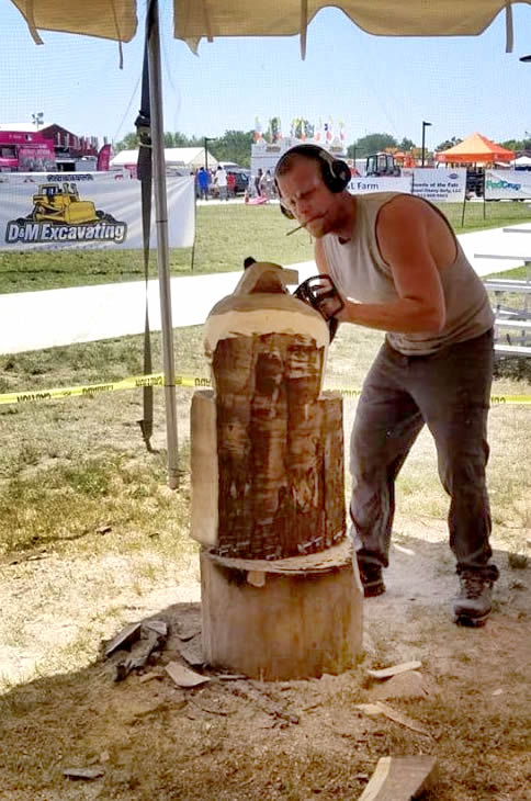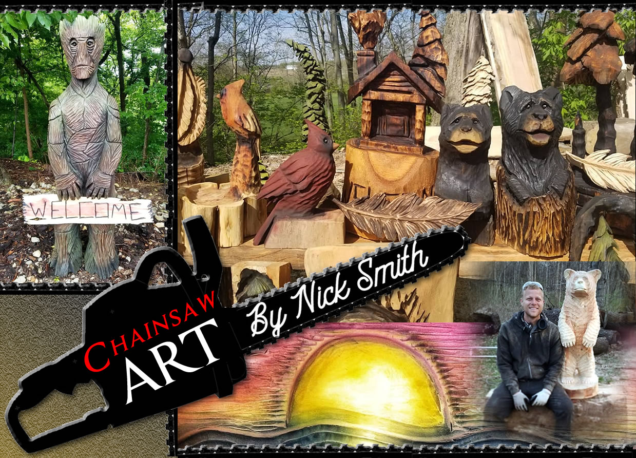 With 3 to 4, 1- hour show's per day, Nick offers Professional Chainsaw Carving Demonstrations. This includes: Speed carving demonstrations creating wood sculptures including; birds, mammals, fish, abstract, local/state specific animals (bears, eagles, owls, sea life etc), Signs, wall hanging slabs, structural/architectural type of pieces, like farm equipment, barns, cabins. NOTE: Detail and finishing work will be done between shows.