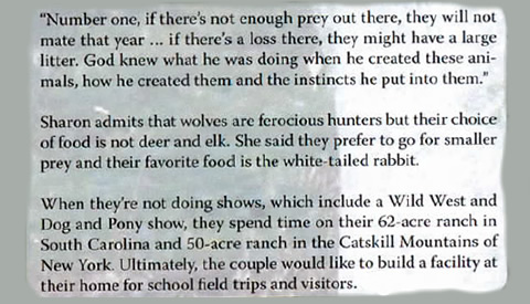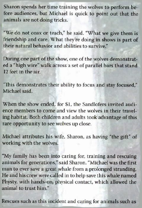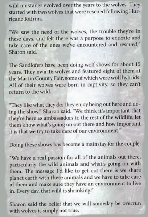 "In 2013, we had the Wolves of The World at our Greater Philadelphia Outdoor Sportshow. In almost 40 years of booking feature attractions for our sport shows, I would rate this attraction amongst the top three. Michael and Sharon Sandlofer are true professionals. The wolves were clean and healthy, their pens and demonstration area were always clean and the Sandlofers are excellent emcees of their program. This is an attraction that will definitely attract new attendees to an event."