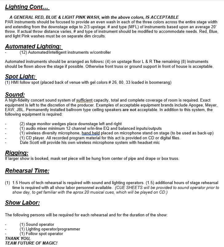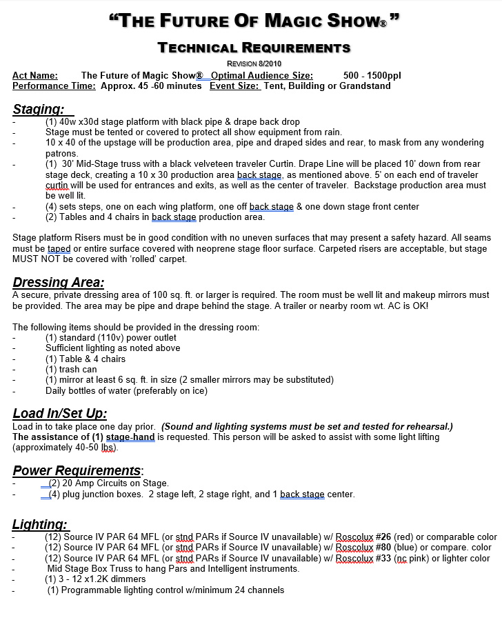 - 6 Performers 1 Illusion/Stage Mgr., 1 Tec Director.