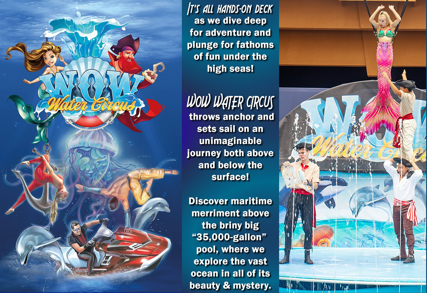Wesley has found success in combining modern and traditional styles of circus art and festival entertainment along with a heartfelt story line to hold the audience captive throughout the show. The WOW Water Circus is incomparable to any other production on the road today. Join us on a deep dive under the sea that coasts only as far as your imagination will take you!