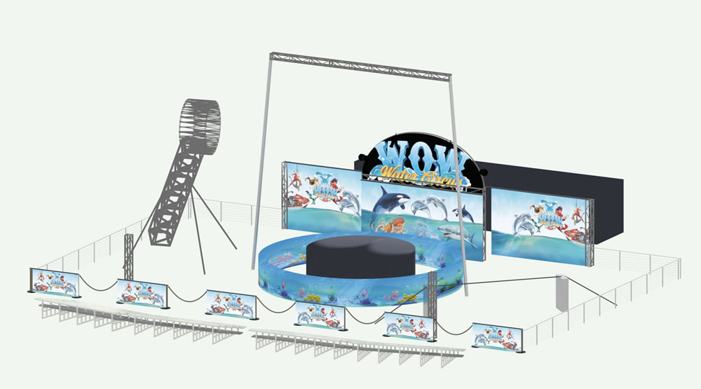 AREA NEEDED: 80’x 80’ level ground with no slopes, uneven spots, overhead wires, impediments or obstructions. This space does not include seating for patrons. This is a water show and there will be moments during the show water splashes outside the pool area. Please plan accordingly for this.